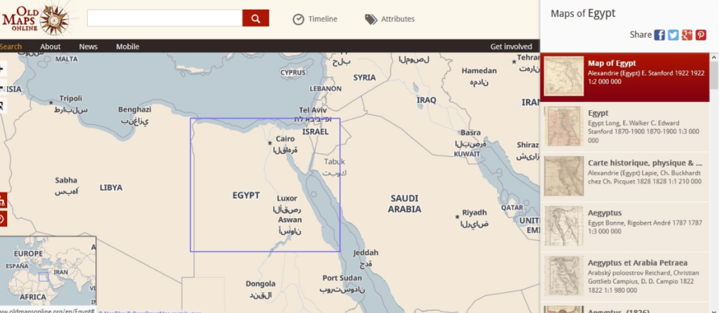 فضلًا، لا تتجول كثيرا في الشبكة العنكبوتية فإليك خدمة تراكب الخرائط القديمة مع الخرائط الحديثة، يقدمها موقع Old Maps Online ، يوفر عليك الموقع خدمة البحث عن الخرائط القديمة في الشبكة العنكبوتية ويجمعها في موقعه من مواقع متنوعة. أيضا هذه الخرائط معظمها تم تصحيحة مكانيا ويتيح لك التعديل في نقاط الإرجاع المكاني لها.